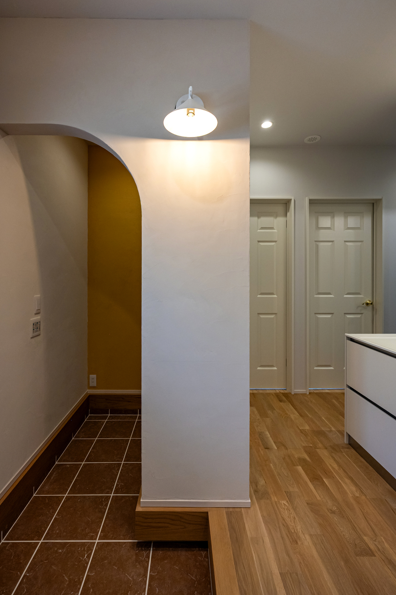 靴を履くのに便利な造作ベンチ、木製の手すり、そしてニッチなど要望通りにつくります。