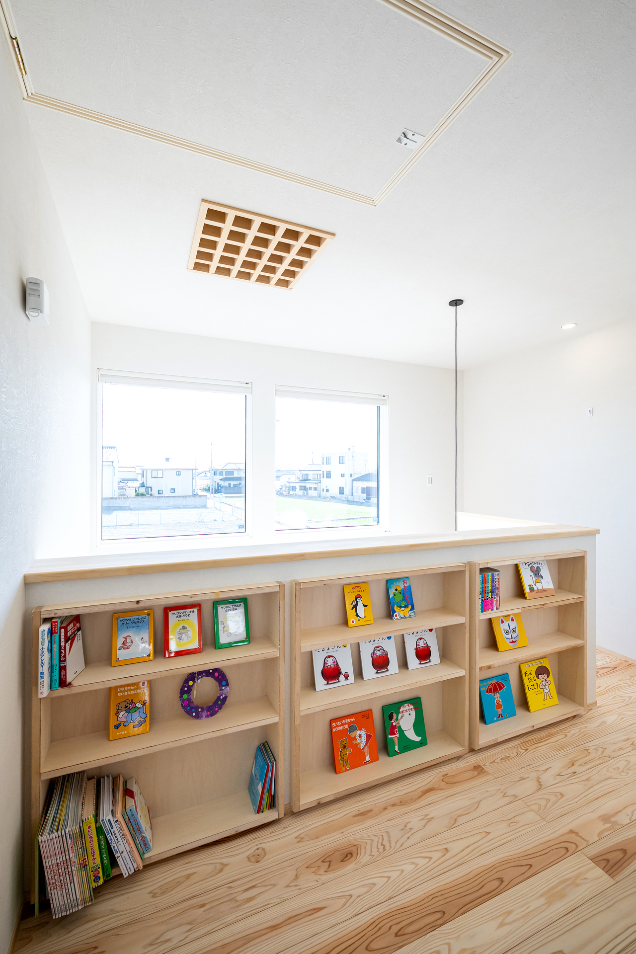 2階ホールの本棚、そして天井の四角の格子は小屋裏エアコンの吹き出し口