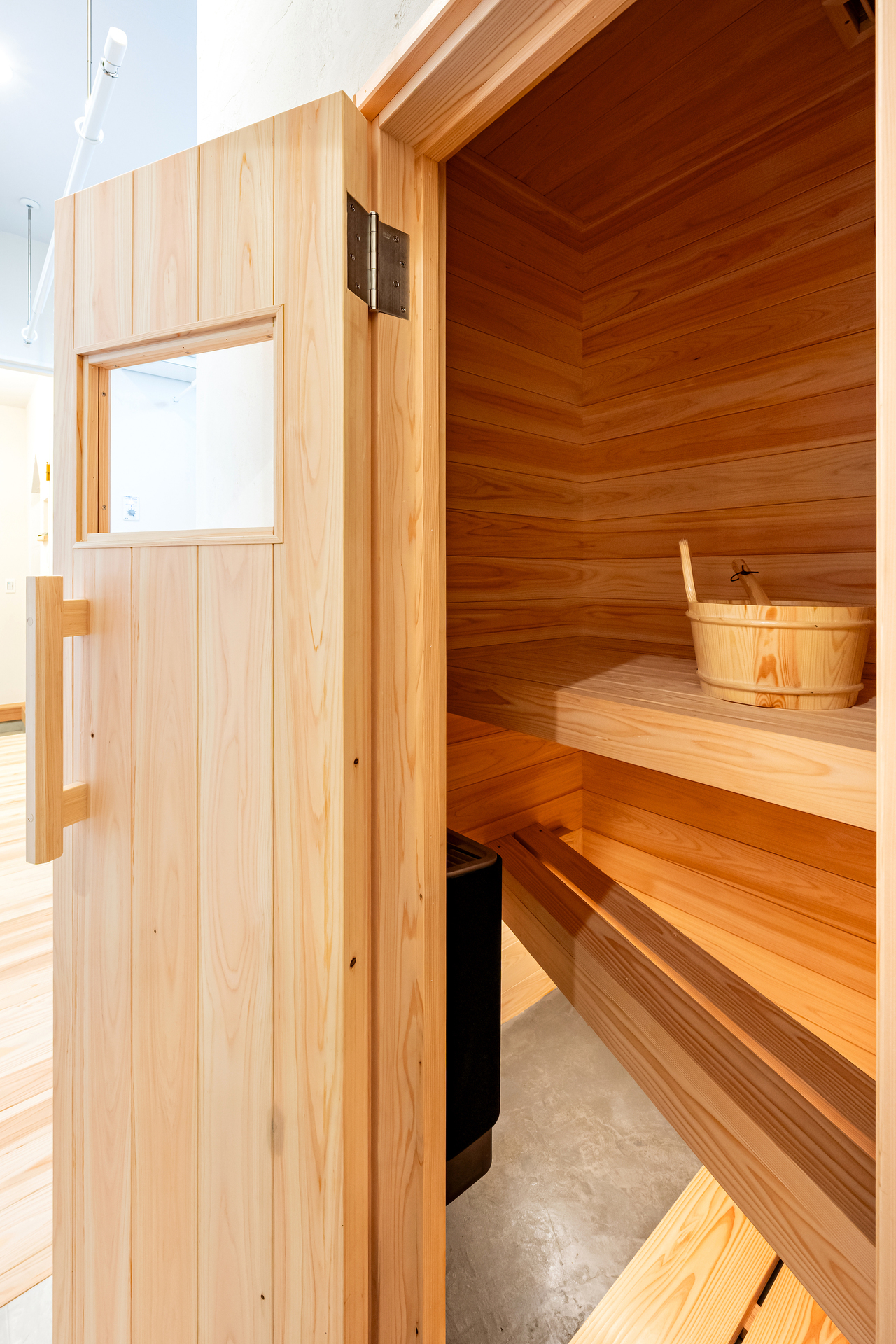 サウナ室の床ですがモールテックスであれば洗う事も可能。